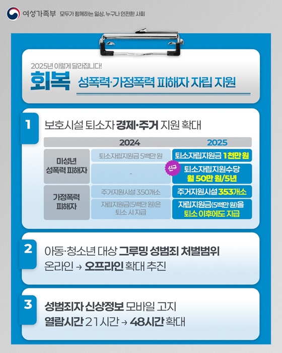 | 성폭력·가정폭력 피해자 보호시설 퇴소자 지원 확대 |