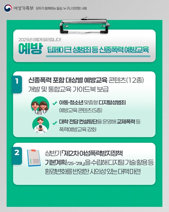 2025년 여성가족부는 디지털성범죄, 스토킹, 교제폭력 등 신종 폭력에 체계적이고 선제적으로 대응해 누구나 안전한 일상을 누릴 수 있도록 올해 추진되는 주요 대응책입니다.