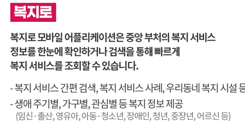 - 기능: 복지로 애플리케이션은 다양한 복지 서비스에 대한 정보를 제공하며, 사용자가 자신의 상황에 맞는 복지 지원을 쉽게 찾을 수 있도록 돕습니다. 복지 지원 신청 및 진행 상황을 확인할 수 있는 기능도 포함되어 있습니다.