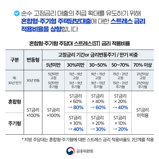 - 변동금리는 금리 인상 시 더 취약하므로, 스트레스 금리를 더 높게 적용합니다.